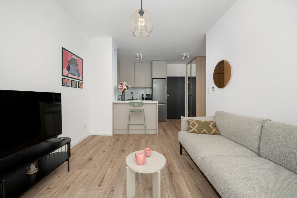 W salonie nierozkładana kanapa, tv i miejsce do spożywania posiłkow przy wyspie kuchennej. Z salonu można wyjść na balkon.
