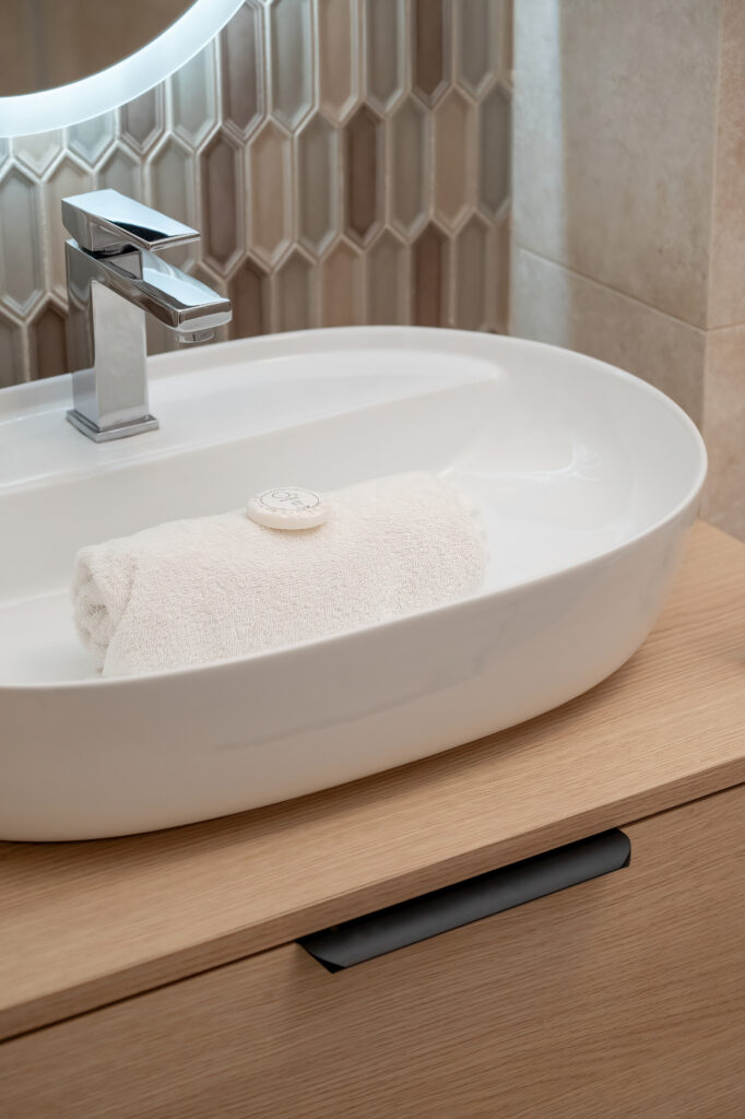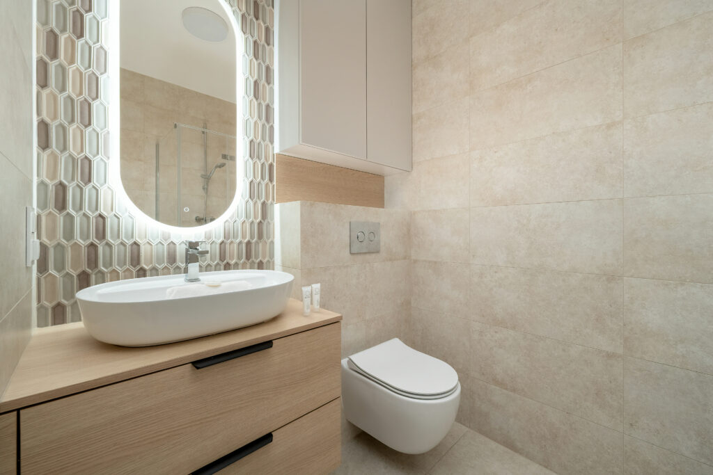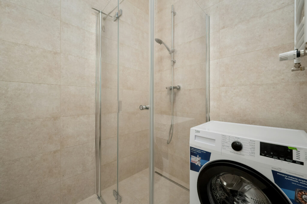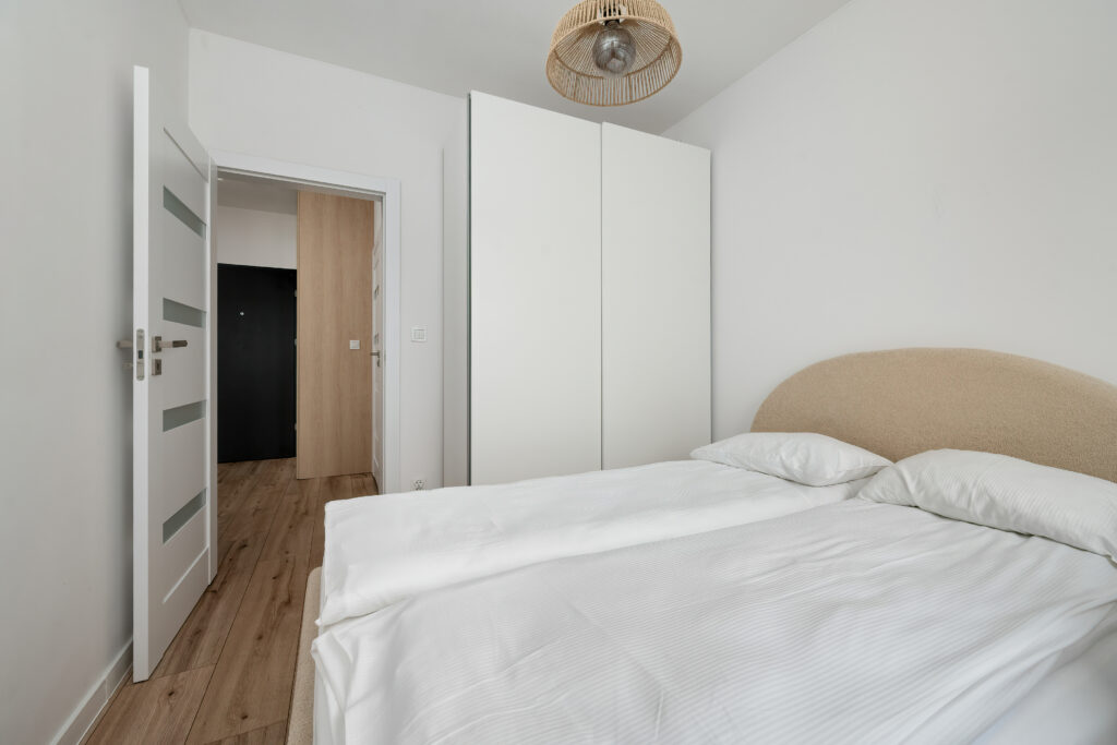 W sypialni znajduje się pojemna szafa, komfortowe podwójne łóżko (140cm) oraz szafka nocna na podręczne drobiazgi. Elegancka, nowoczesna łazienka została wyposażona w poświetlane lustro, kabinę prysznicową i pralkę.