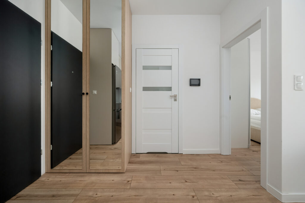 Przy wejściu do dyspozycji duża szafa.Kuchnia oferuje sporo miejsca do przechowywania oraz nowy sprzęt taki jak płyta indukcyjna, piekarnik, zmywarka, kuchenka mikrofalowa, czajnik, lodówka z zamrażarką.