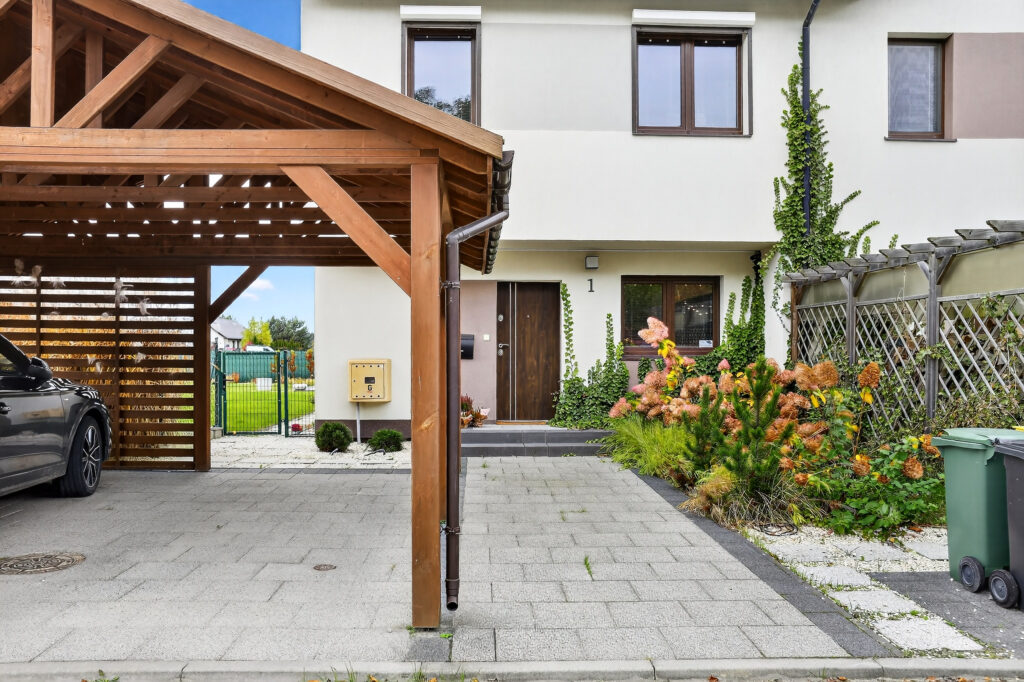 - Od frontu na zadaszonym podjeździe znajdują się dwa miejsca postojowe.