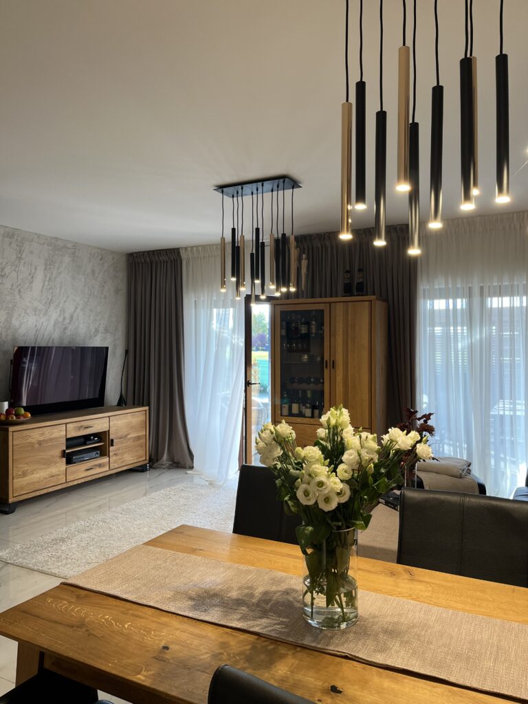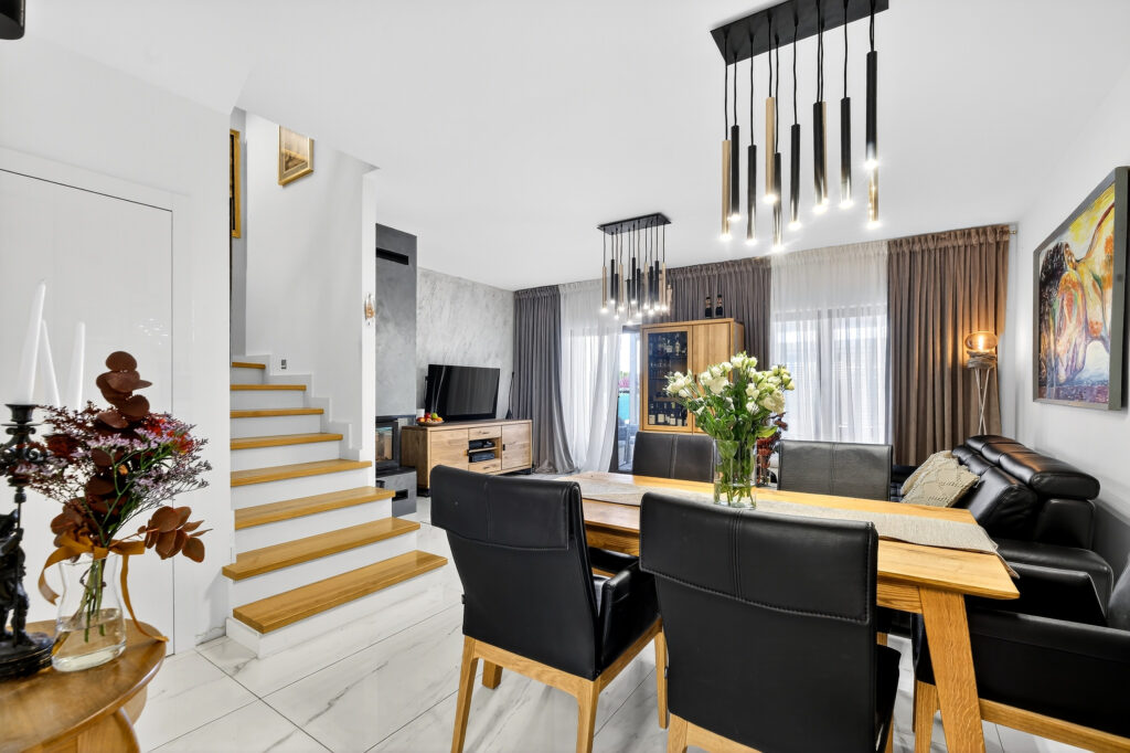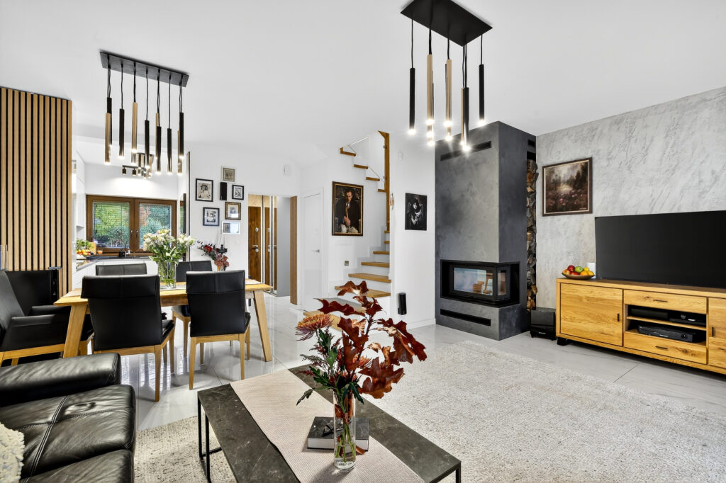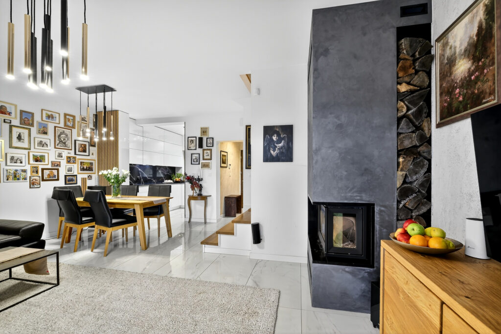 - otwartego salonu z klimatycznym kominkiem, którym dodatkowo ogrzejemy nieruchomość