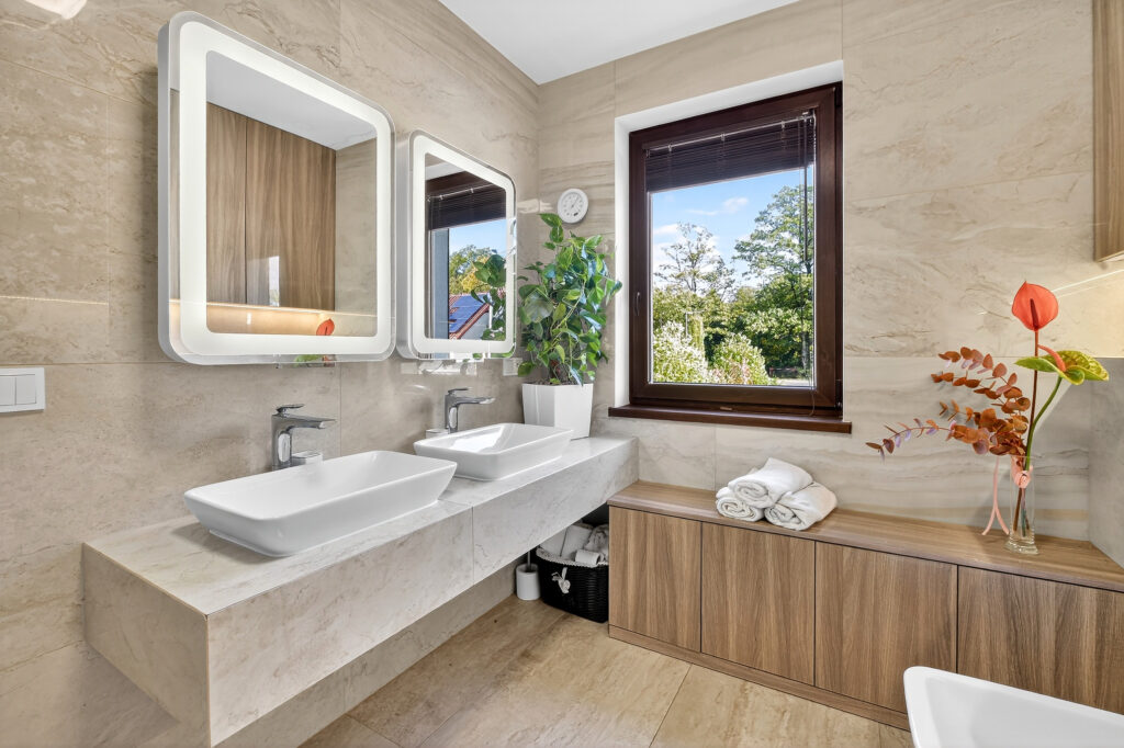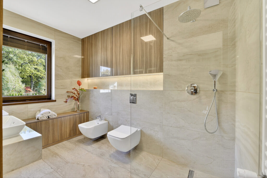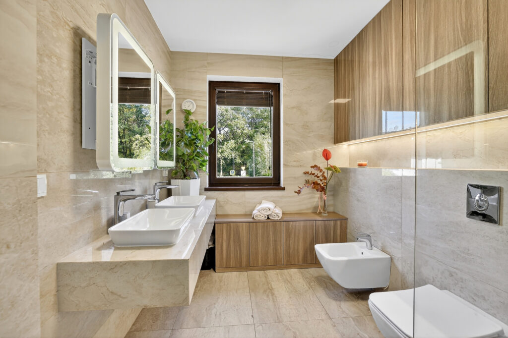 - widną, komfortową łazienkę z prysznicem, dwoma umywalkami, bidetem